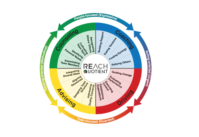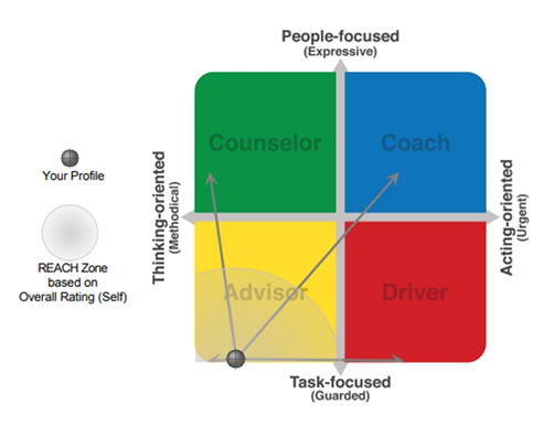 An individual's primary archetype is identified as one of 4 primary styles: Counselor (green), Coach (blue), Advisor (yellow) and Driver (red), growing agility into the other styles is achieved by developing the skills most commonly associated with the other primary styles. As a person grows their agility to stretch into the other styles they grow their REACH and in turn improve their effectiveness in different situations.